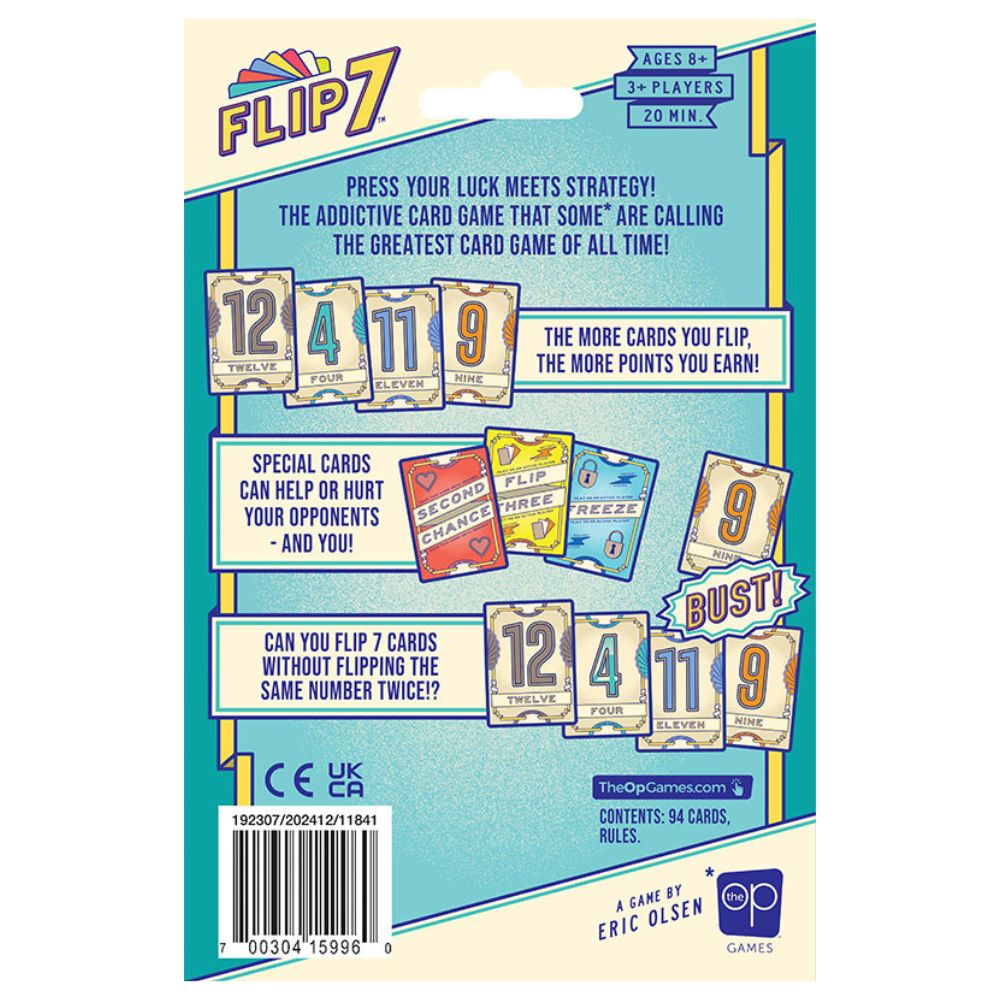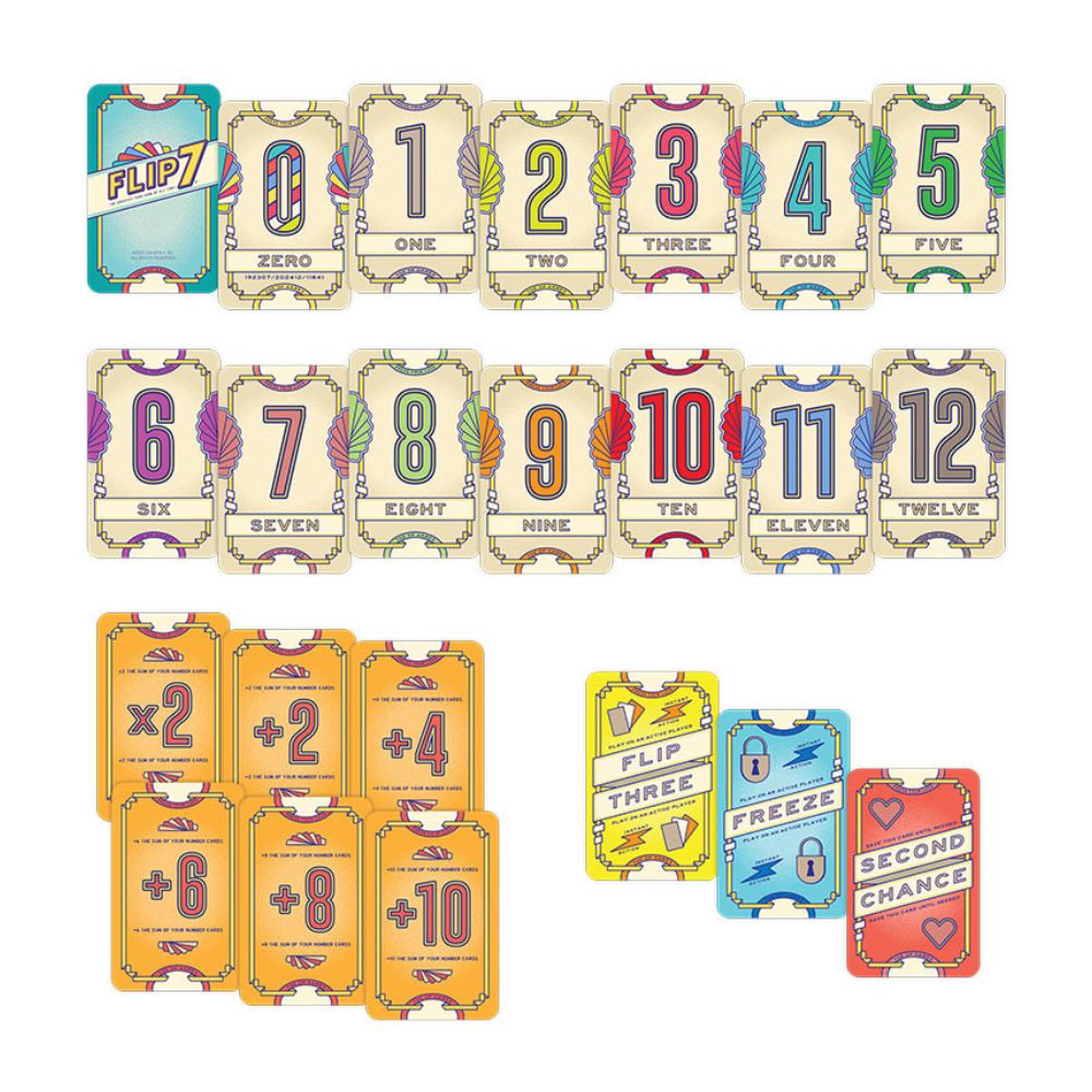 Låter enkelt? Tänk igen! Det här är inte vilken kortlek som helst … I Flip 7 finns det bara ett 1‑kort, två 2:or, tre 3:or osv, plus en massa specialkort som kan ge dig extrapoäng, ge dig en andra chans eller frysa dig eller dina motståndare i steget.