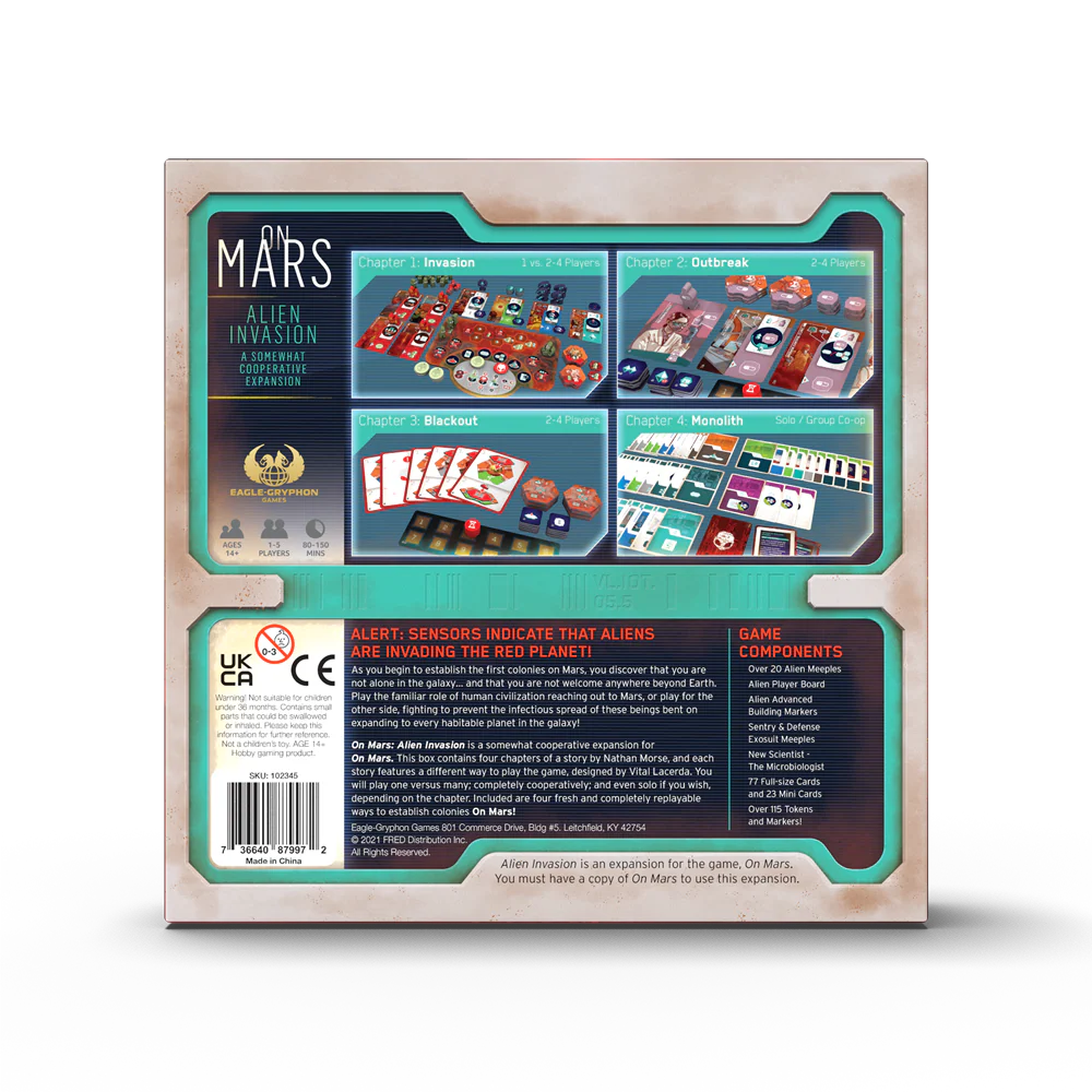 On Mars: Alien Invasion är den efterlängtade, delvis kooperativa expansionen till Vital Lacerdas bästsäljande och högt rankade grundspel On Mars. Expansionen var ursprungligen tänkt att heta Surviving Mars, men Eagle-Gryphon Games valde att byta namn till On Mars: Alien Invasion för att bättre spegla expansionens tema och innehåll. Spelets berättelse är uppdelad i fyra kapitel i en historia skriven av Nathan Morse. Spelmekaniskt innehåller expansionen fyra nya och olika sätt att bygga vidare på och spela grundspelet. Beroende på kapitel kan du spela en-mot-många, helt kooperativt eller till och med solo. Här ingår fyra fräscha och fullt omspelningsbara sätt att etablera kolonier på Mars!